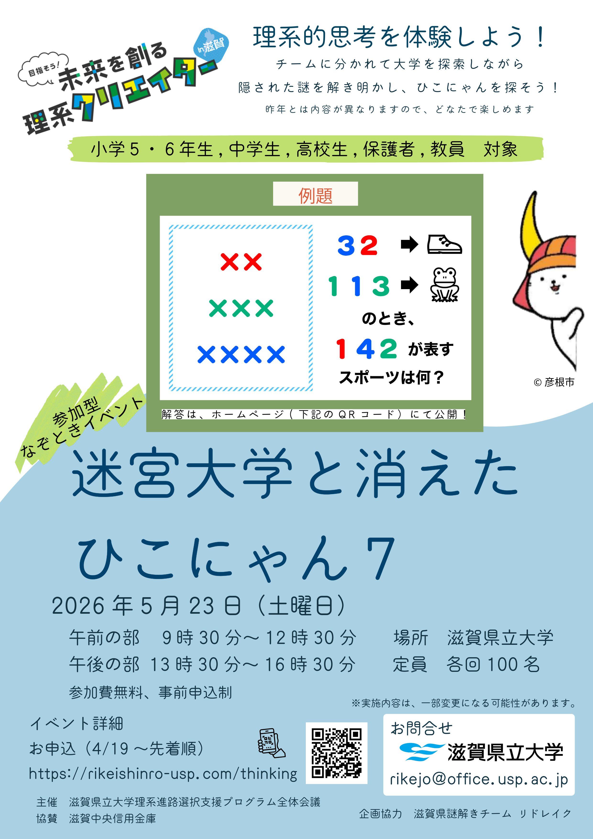 なぞ解きイベント『迷宮大学と消えたひこにゃん7』を開催します【理系進路選択支援プログラム】小学5年生~高校3年生対象