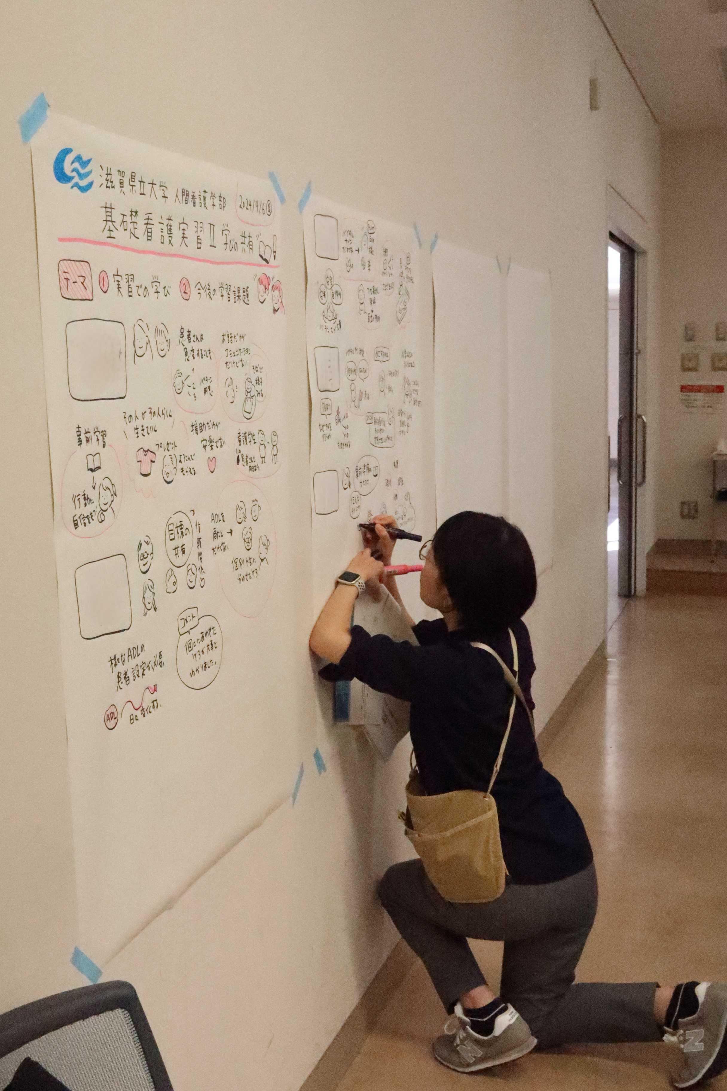 7月に4回生科目:人間看護学統合実習、8、9月に1、2回生科目:基礎看護学実習Ⅰ・Ⅱを実施し、それぞれの最終日に実習の学びをまとめたものを発表しました。その際、フリーランスイラストレーターである大道レイチェルさんをお招きし、グラフィックレコーディングをしていただきました。グラフィックレコーディングとは、ミーティングでの議論内容や提案を、絵や図形などのグラフィックを用いてリアルタイムにまとめる手法です。今回は、実習のまとめの発表会の中から、重要となる要素をビジュアル化することで、学生によりわかりやすく学びを共有することを目的として導入しました。発表者の似顔絵や発表内容を可愛くデザインしていただき、学びを深めるとともに楽しく学べる機会になりました。
