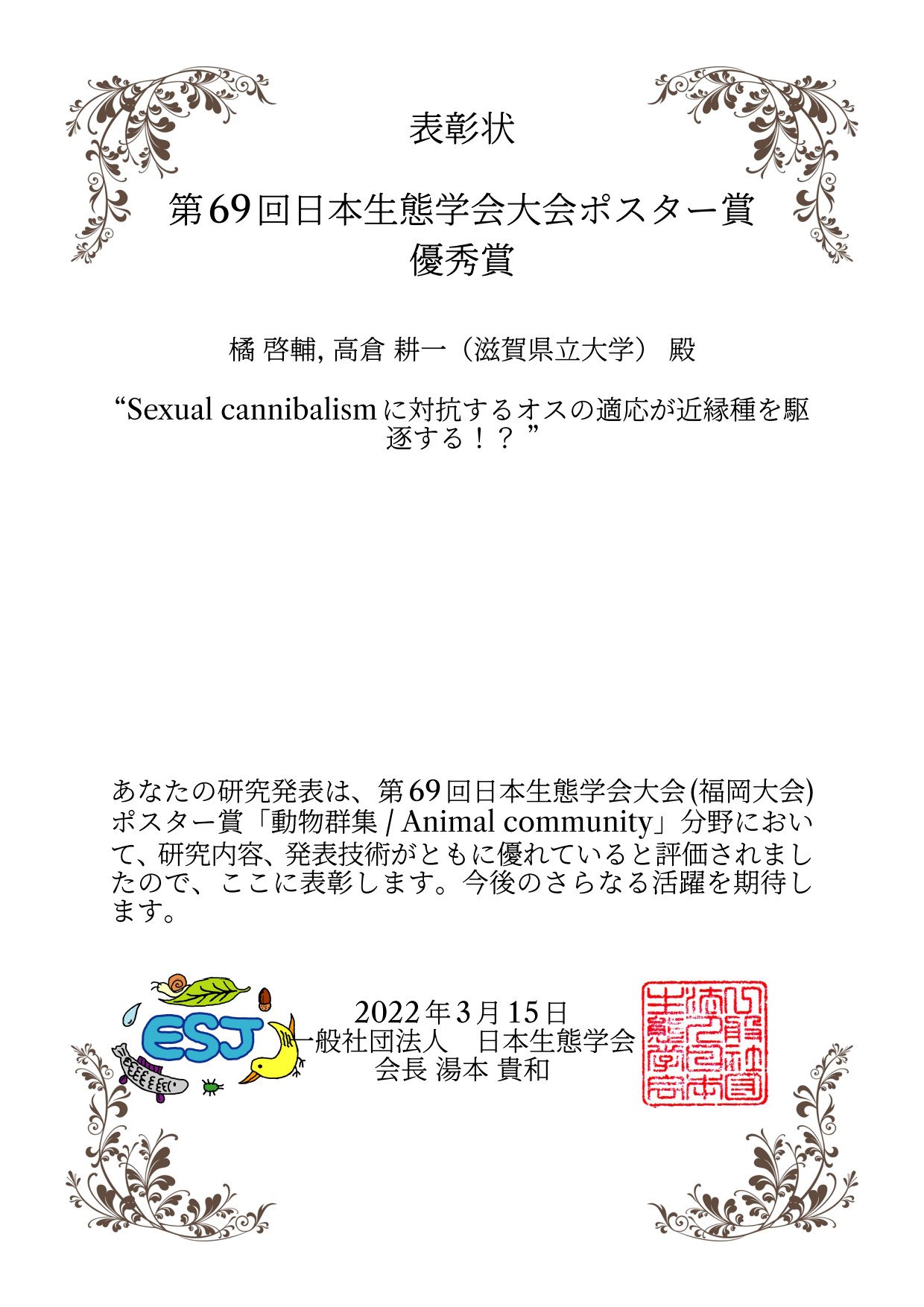 大学院環境科学研究科環境動態学専攻の橘啓輔さんが日本生態学会第69回大会において「ポスター優秀賞」を受賞しました