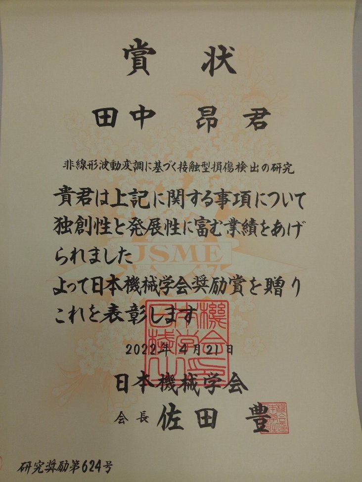 機械システム工学科の田中昂講師が2021年度日本機械学会奨励賞(研究)を受賞しました