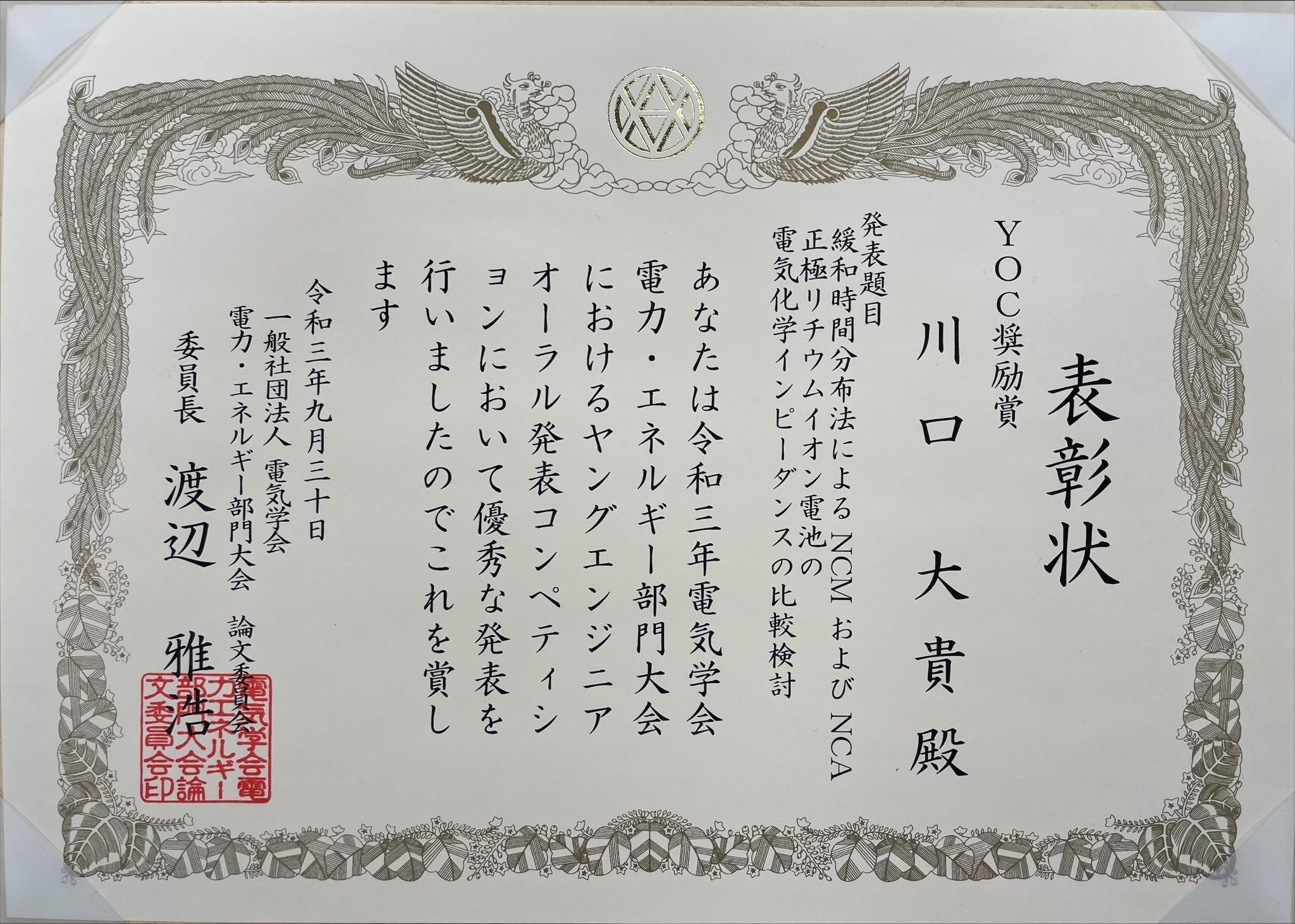 工学研究科電子システム工学専攻の川口大貴さんが「令和3年電気学会電力・エネルギー部門大会」における研究発表でYOC奨励賞を受賞しました